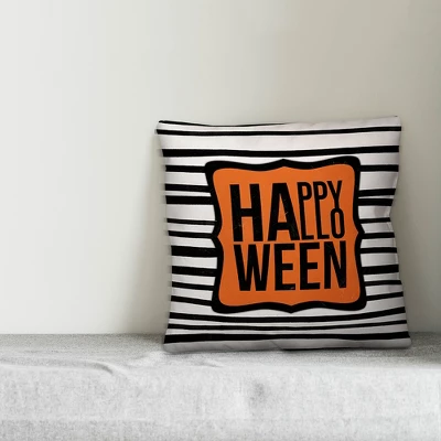 The Happy Halloween Stripes 16×16 Indoor / Outdoor Pillow from our Halloween Collection features the words Happy Halloween on a fun patterned background. This indoor/outdoor pillow helps you add some trendy art to your home this holiday season. Digitally printed on demand, this exclusive design displays vibrant colors. The result is a quality crafted product that makes for a stylish addition to your home. Our beautiful indoor/outdoor pillows are designed and printed in the USA. Double-sided Print16x16Cover Material: Spun Polyester Fill Material: Polyester/PolyfillRemovable Cover: No No UV protection Stain, mildew, and water resistant Washing Method: Spot clean and dry clean only