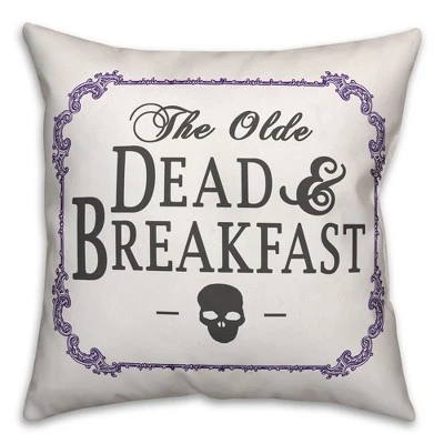 The Dead and Breakfast 16×16 Indoor / Outdoor Pillow from our Halloween Collection features a wickedly brilliant design you can use to invite guests to check in for a night they’ll never forget. The punny bed and breakfast pillow comes elaborately decorated with distressing and a purple scroll border that creates a vintage look. This indoor/outdoor pillow helps you create a frightening atmosphere in your house this fall. Digitally printed on demand, this exclusive design displays vibrant colors. The result is a beautiful design you’re sure to love. Our beautiful indoor/outdoor pillows are designed and printed in the USA. Double-sided Print16x16Cover Material: Spun Polyester Fill Material: Polyester/PolyfillRemovable Cover: No No UV protection Stain, mildew, and water resistant Washing Method: Spot clean and dry clean only