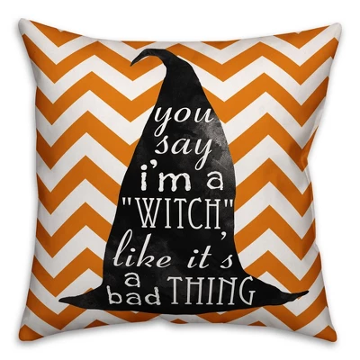 The Witchy Saying 16×16 Indoor / Outdoor Pillow from our Halloween Collection features a witchy tongue-in-cheek sentiment on a black pointy witch hat. The orange and white chevron background adds a contemporary feel to the traditional Halloween colors showcased in this accent piece. This indoor/outdoor pillow helps you add some fun to your interior decor this Halloween. Digitally printed on demand, this exclusive design displays vibrant colors. The result is a beautiful accent piece that will make you the envy of the neighborhood. Our beautiful indoor/outdoor pillows are designed and printed in the USA. Double-sided Print16x16Cover Material: Spun Polyester Fill Material: Polyester/PolyfillRemovable Cover: No No UV protection Stain, mildew, and water resistant Washing Method: Spot clean and dry clean only